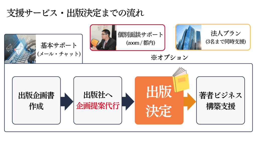 「出版企画の作成」「出版社との交渉」「原稿の執筆フォロー」「販売促進・ビジネスモデル構築」等のサービスを通じて、あなたの”著者という新事業”を立ち上げ、軌道に乗せる支援を行います。